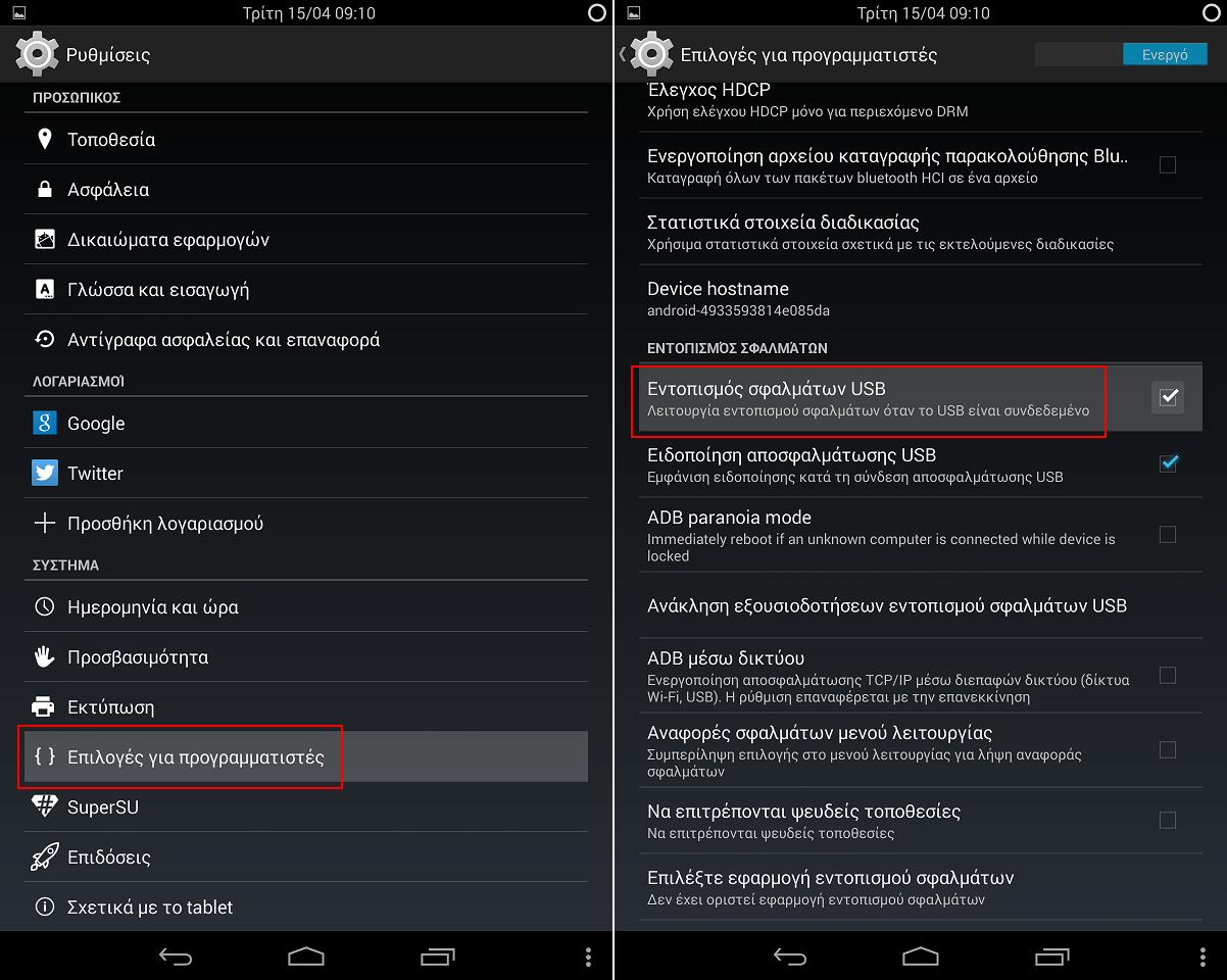 Το Android διαθέτει ένα κρυφό μενού για προγραμματιστές που θέλουν να τεστάρουν τη συσκευή, την εφαρμογή ή τη ROM που έχουν δημιουργήσει και εκεί κρύβεται ο "Εντοπισμός σφαλμάτων USB". Για να το ενεργοποιήσουμε θα πρέπει να πάμε "Ρυθμίσεις > Σχετικά με το τηλέφωνο" και να πατήσουμε πολλές φορές το "Αριθμός έκδοσης". Βγαίνοντας από αυτό το μενού θα δούμε πλέον το "Επιλογές για προγραμματιστές" στο οποίο κρύβεται το "Εντοπισμός σφαλμάτων USB" όπως και άλλες χρήσιμες αλλά και περίεργες λειτουργίες για να παίξουμε μαζί τους.